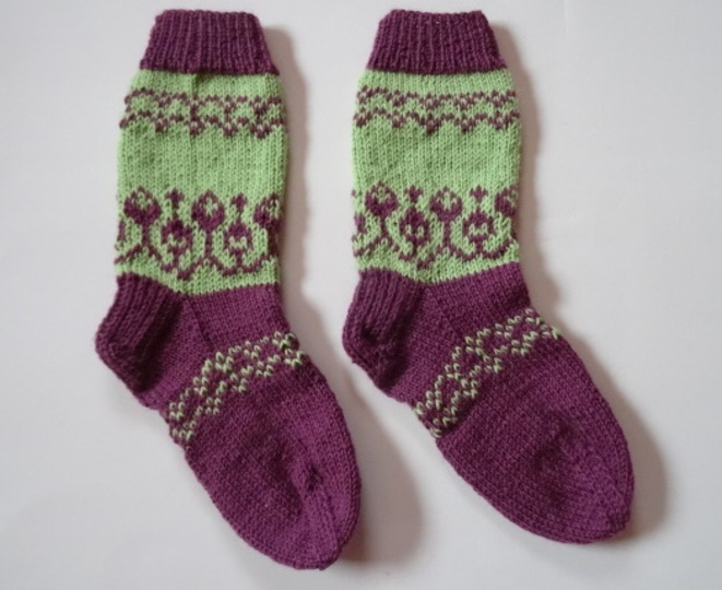 Anleitung für Socken in zwei Farben für Gr. 38/39. Für diese Socken sollte man Übung im Sockenstricken haben, in der Runde und zweifarbig stricken können. Die Anleitung umfasst 3 Seiten und enthält eine detailierte Beschreibung mit Musterschemata zum Stricken. Da die finnische Wolle (Nalle von Novita) in Deutschland nicht erhältlich ist, hier Vorschläge für entsprechende Garne. 100g der Wolle Nalle entsprechen 260 m. (Maschenprobe: 22 M und 32 Reihen entsprechen 10 x 10 cm)