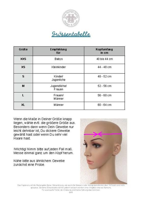 von XXS-XL Kopfumfang von 40 bis 64 cm. Inklusive Größentabelle und Stofftabelle