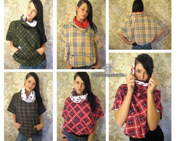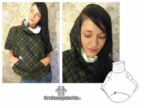 Das Cape kann sowohl aus Wolle, Strick und Sweatstoff, wie auch aus wasserdichten Stoffen für z.B. ein Regencape genäht werden. Der Umhang ist kurz gehalten und macht dadurch immer eine gute Figur. Die runde aufgesetzten Tasche ist eine schöner Blickfang auf dem Cape.