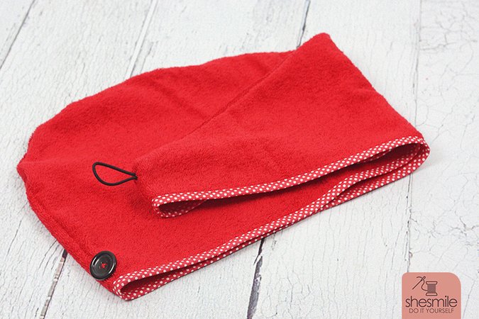 Perfekt auch in der Sauna oder bei kosmetischen Gesichtsanwendungen. Der Haarturban kann von beiden Richtungen aufgewickelt und festgeknöpft werden. Aus Frottee-Resten genäht ist das Haartuch ideal nach dem Haarefärben zu Hause.