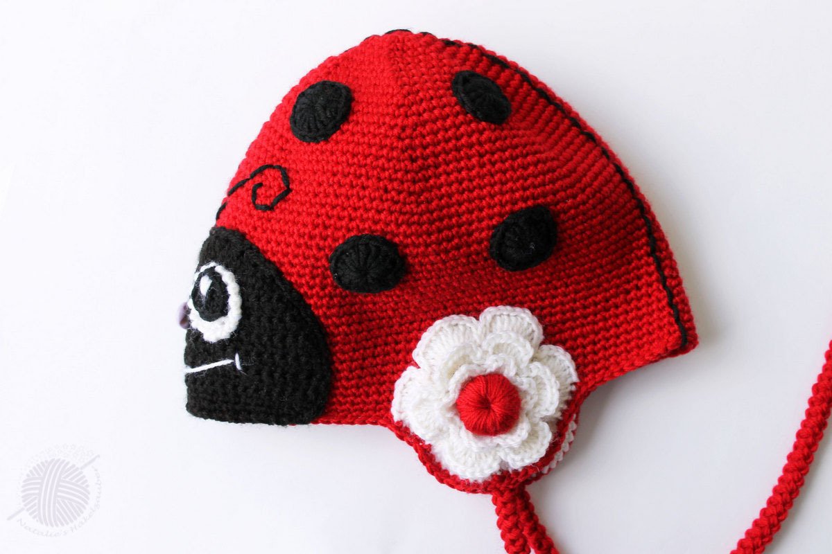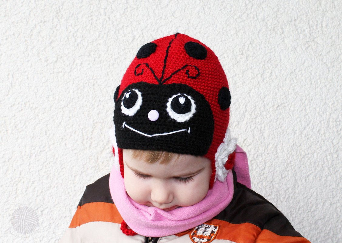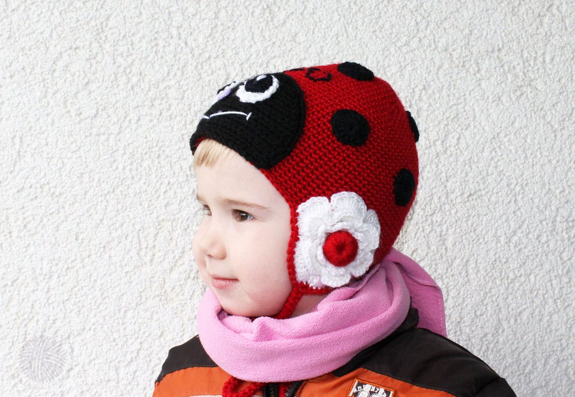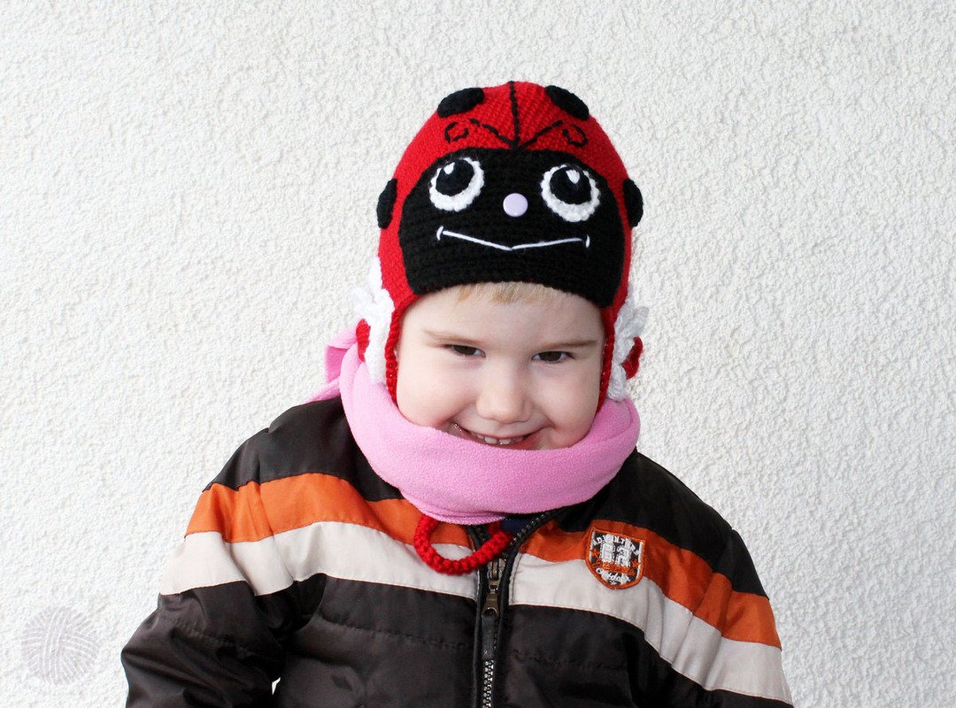 Diese PDF-Häkelanleitung besteht aus bebilderter Anleitung zum Häkeln einer Mütze in der Form eines Marienkäfers mit den Blumen als Ohrenklappen. Die Größe wird während des Häkelns des Bodens der Mütze angepasst (wird in der Anleitung erklärt).