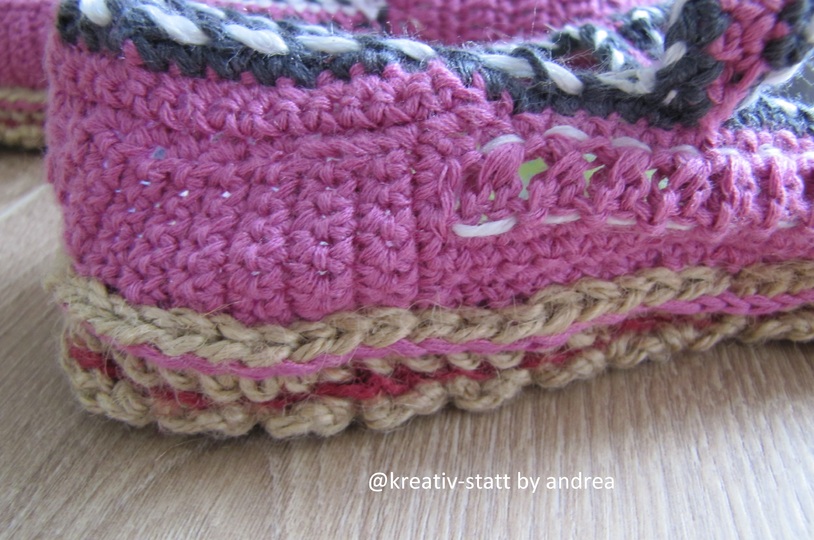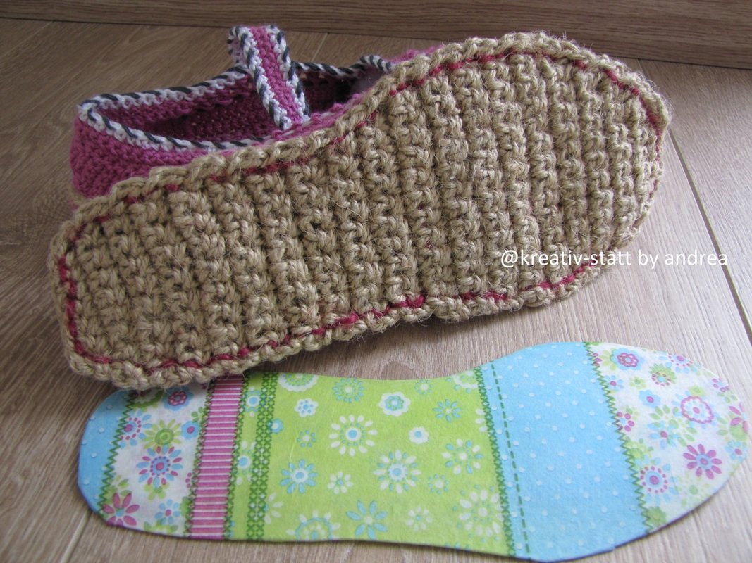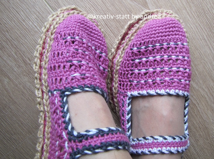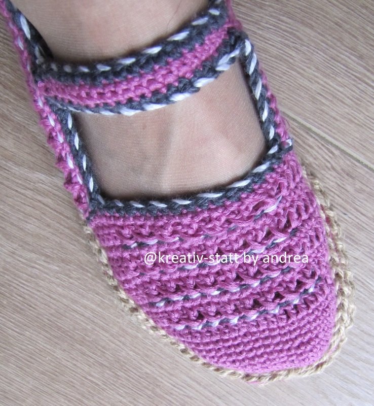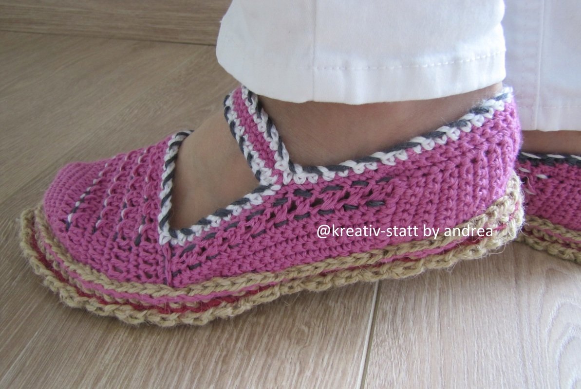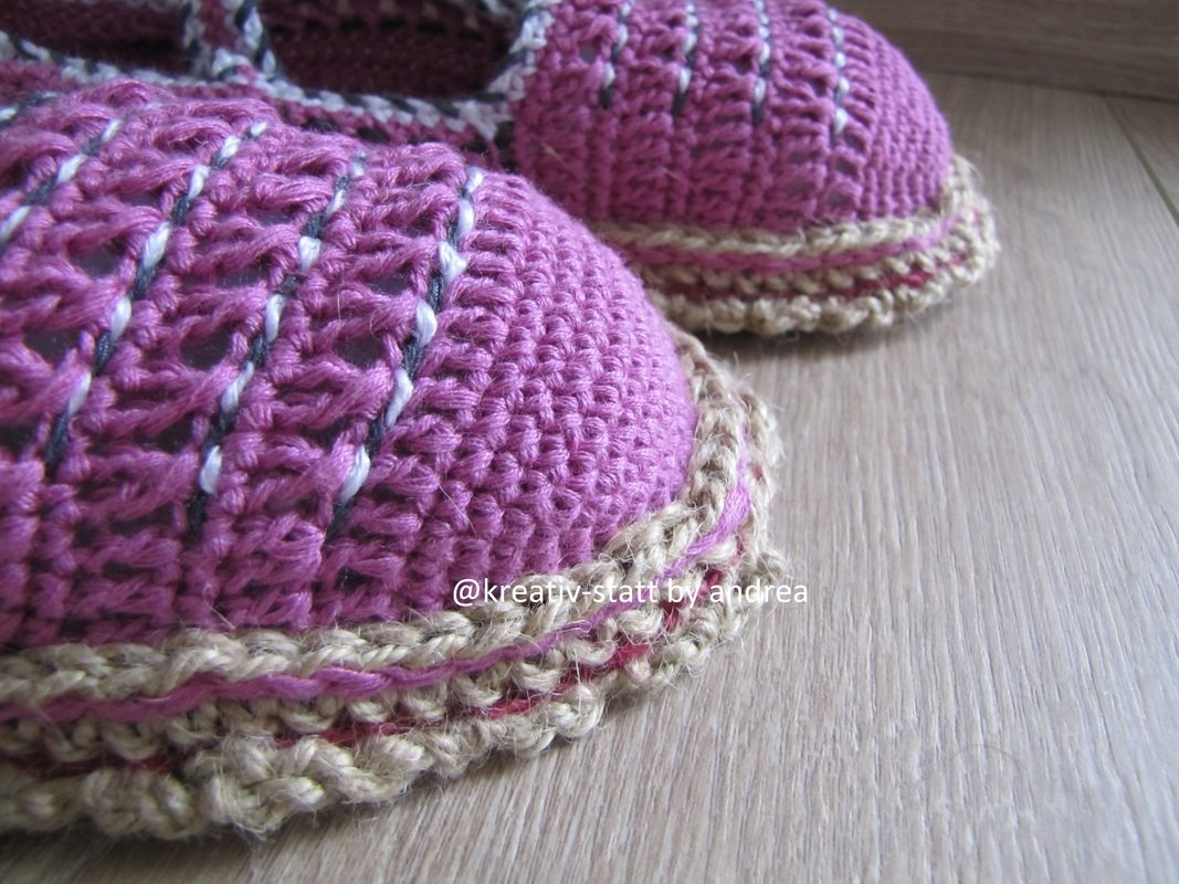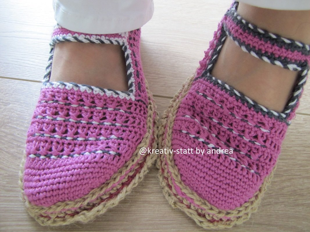 Die Anleitung für die Ballerinas und die Anleitung für die gehäkelte Espadrilles-Sohle in Reihen.