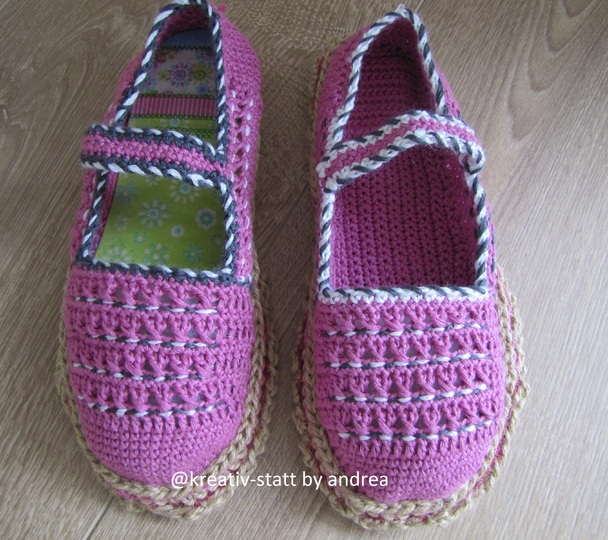 Die Anleitung ist für Schuhgröße 40/41 gehäkelt. In der Anleitung wird genau erklärt wie man diese Ballerinas und auch die Espadrilles-Sohle häkelt und zusammenführt. Du kannst mit diesen Anleitungen jede Schuhgröße häkeln.