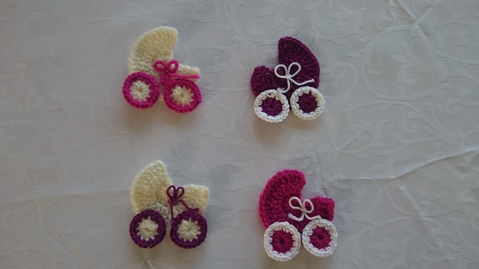 Diese kleinen süßen Kinderwagen kann man super als Aufnäher verwenden oder eben auch als Tischdeko bei einer Taufe. Wenn man die Kinderwagen etwas größer häkelt (also mit dickerer Wolle und entsprechender Nadel) kann man die Kinderwagen auch als süße Namenskärtchen gestalten.