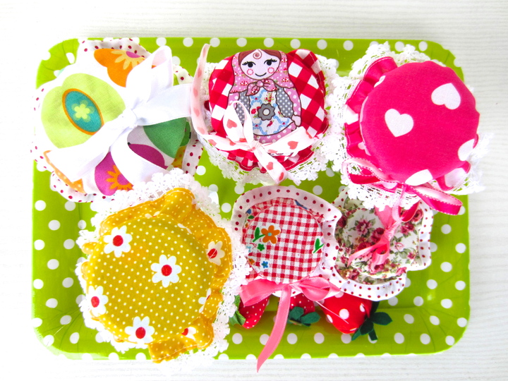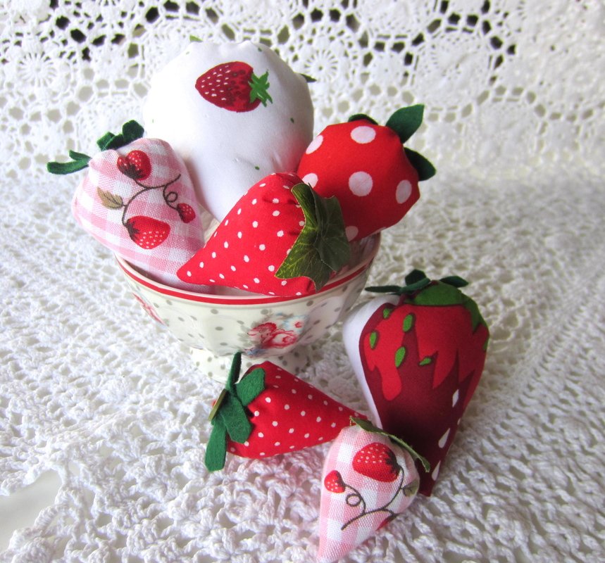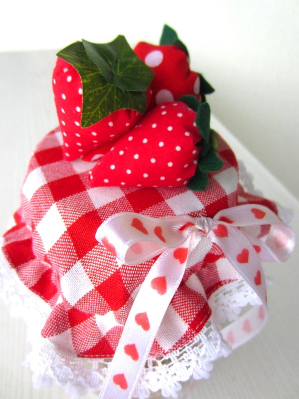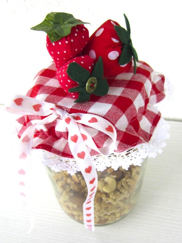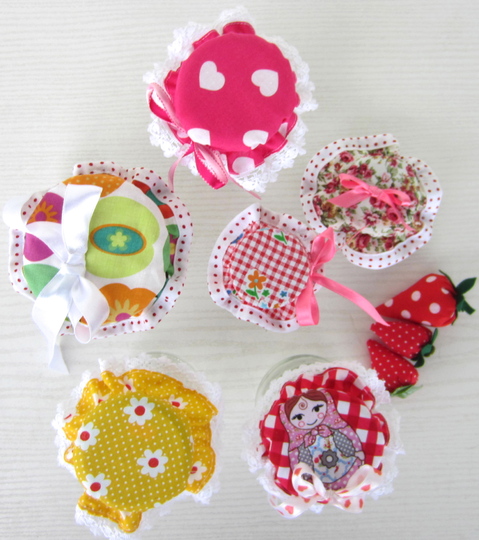 Gebrauchte Gläser sammeln und schnell und einfach aus Stoffresten Häubchen nähen nach Maß oder nach Schnitt in 2 Varianten und 6 Größen und mehr. Erdbeeren in 5 Größen und einigen Varianten.