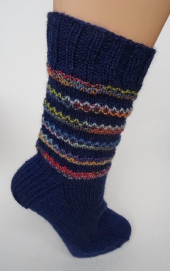 Anleitung für Socken im Streifenmuster in zwei Farben für Gr. 41. Für diese Socken sollte man Übung im Sockenstricken haben, in der Runde, zweifarbig und rechts/links-Muster stricken können. Die Anleitung umfasst 3 Seiten und enthält eine detailierte Beschreibung mit Musterschema zum Stricken. Da die finnische Wolle (Nalle von Novita) in Deutschland nicht erhältlich ist, hier Vorschläge für entsprechende Garne. 100g der Wolle Nalle entsprechen 260 m. (Maschenprobe: 22 M und 32 Reihen entsprechen 10 x 10 cm)