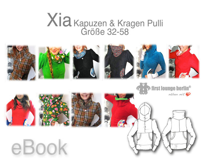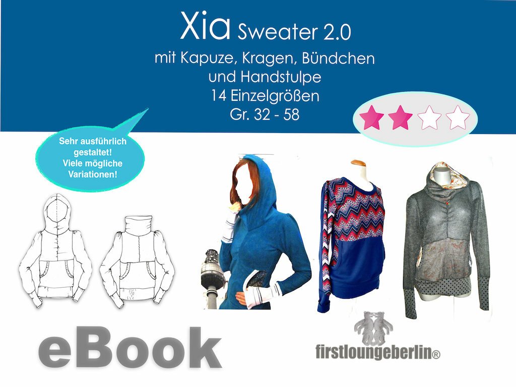 XIA Sweater mit Kragen, Kapuze, Puffärmeln, mit Handstulpen oder klassischen Bündchen. Schnittmuster in 14 Einzelgrößen, Gr. 32-58