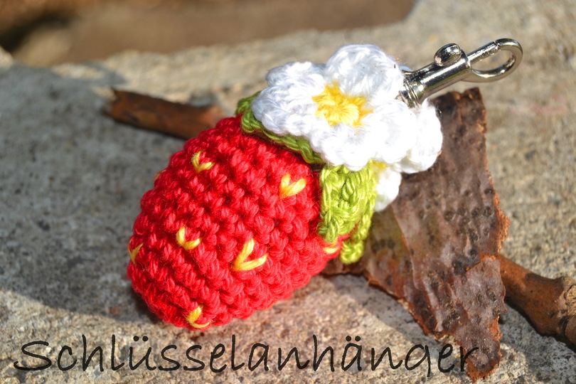 Ausführliche Anleitung für die größte Größen (6-7 cm). Hinweise auf Ändern der Größe, egal ob kleiner oder größer. Ausführlich erklärt ist auch das Kelchblatt, Erdbeerblütenblätter und wie du die Erdbeere als Schlüßelanhänger machen kannst.
