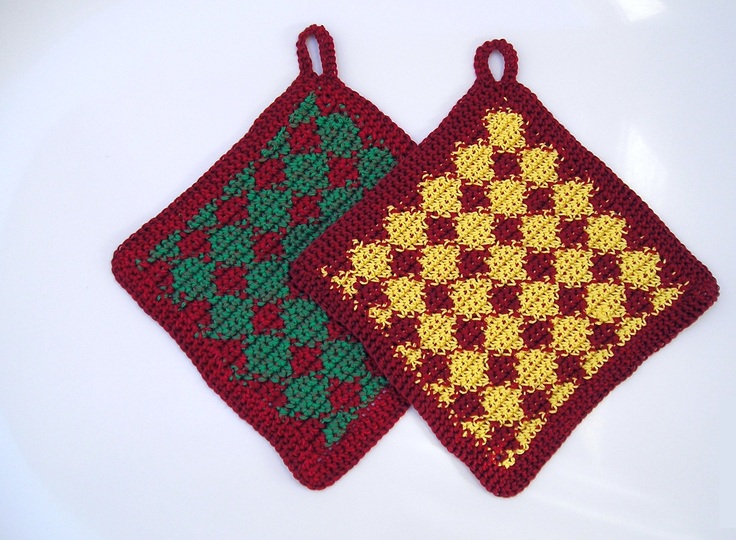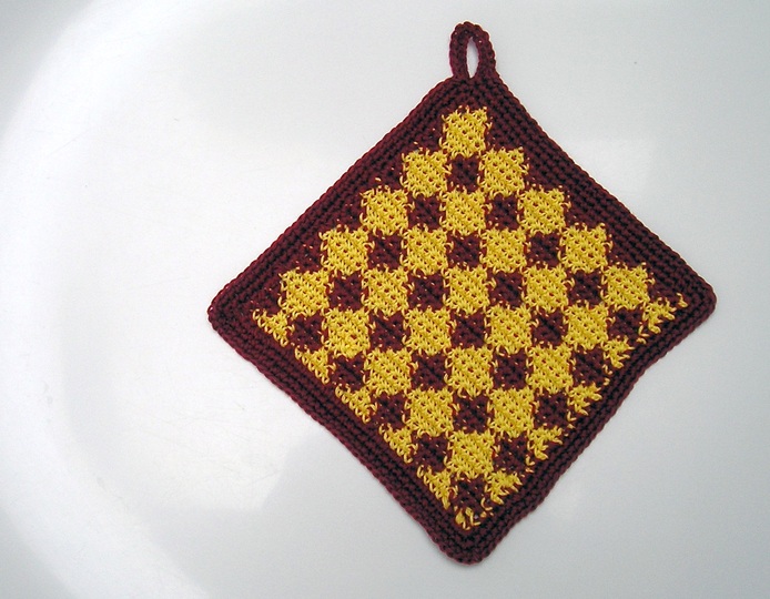 Der Topflappen wird mit festen Maschen mit zwei Fäden gleichzeitig gehäkelt. Man hat einen Arbeitsfaden und einen Ruhefaden, die gewechselt werden, um das Muster zu erzeugen. Das ist nicht besonders schwierig und auch für Häkelnanfängerinnen geeignet. Die Anleitung enthält eine ausführliche textliche Beschreibung und eine Häkelschrift für das Muster.