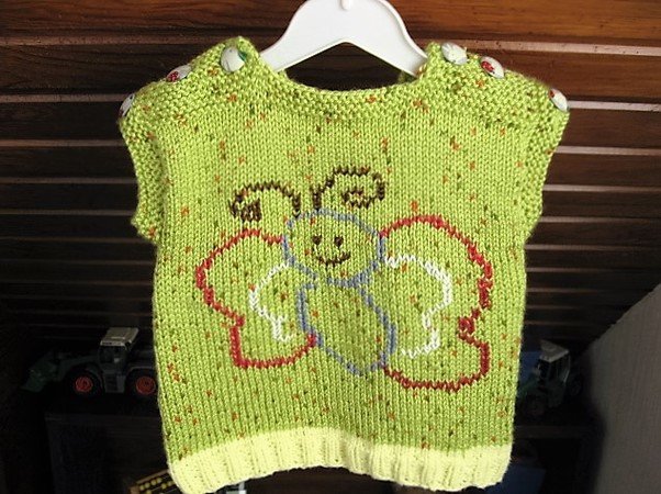 Und da noch Wolle übrig war, bekam seine kleine Schwester noch einen Schmetterlings-Pullunder.