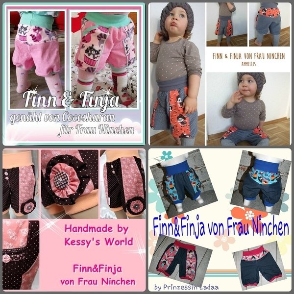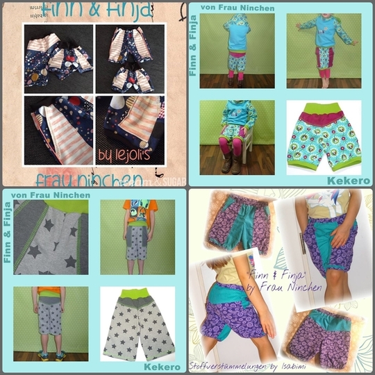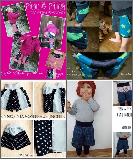 Finn&Finja ist eine coole schnell genähte kurze Hose, die sowohl für Jungs als auch für Mädels genäht werden kann... die überlangen Taschen und die unterteilte hintere Hose verleihen ihr den gewissen Pfiff... sie läd zum Stoffmixen ein und kann für Mädels natürlich ordentlich „aufgerüscht“ werden... außerdem kannst du die Hose mit normalem Saum oder aber Beinbündchen nähen, was für kleine Mädels ganz besonders niedlich ist.