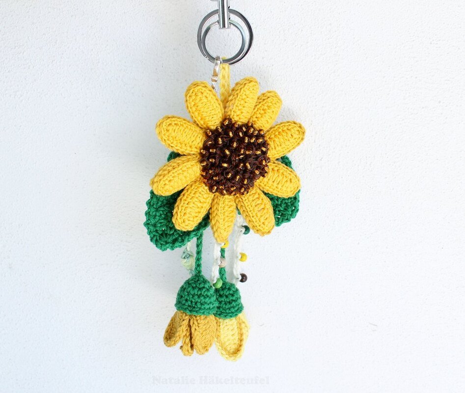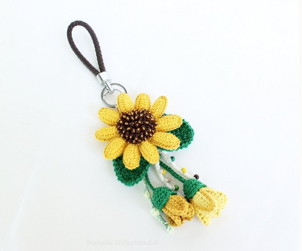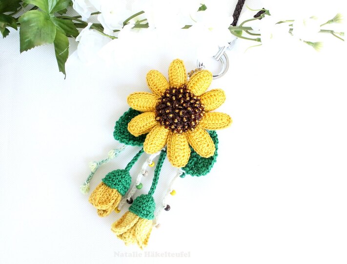 Die umfangreiche, reichlich bebilderte PDF-Häkelanleitung zum Häkeln von einem Anhänger (Taschenbäumler) "Sonnenblume" (mit Knospen, Blättern, Perlenkette) zum Dekorieren des Hauses oder als Mitbringsel für die Freunde. Sonnenblume kann man auch als Schlüsselanhänger oder Anhänger für die Tasche benutzen. Die Blumenblätter rollen sich nicht zusammen (mit ein wenig Füllwatte gestopft), so dass die Sonnenblume auch sehr bequem an der Tasche hängen kann.