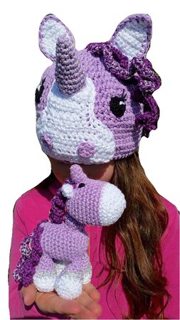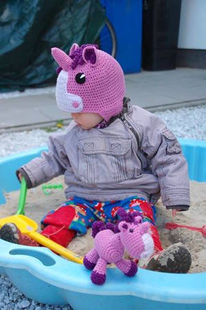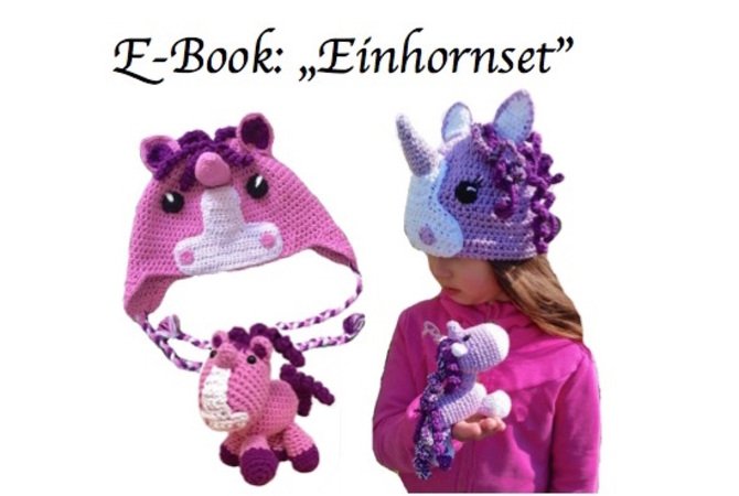 Mütze mit oder ohne Ohrklappen und Amigurumi-Einhorn in den gleichen Farben