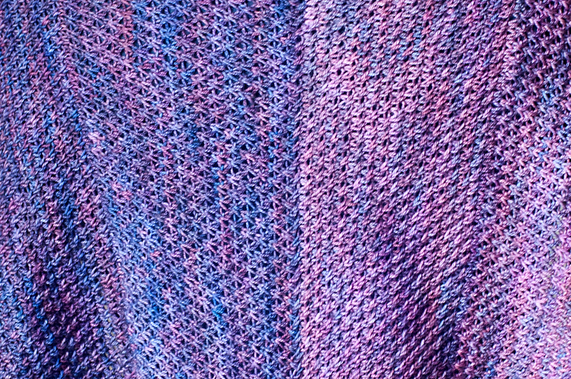 Das Tuch wird seitwärts gestrickt: Man beginnt an einem Ende der Längsseite und nimmt in den Hinreihen lediglich an einer Seite gleichmäßig Maschen zu. Sobald die untere Tuchspitze erreicht ist, werden die Zunahmen einfach in Abnahmen verwandelt, bis zum Schluss alle Maschen abgestrickt sind. Eine perfekte Methode, wenn man nur 2 Knäuel oder Stränge Wolle hat - man hört am Ende des ersten Knäuels mit den Zunahmen auf und fängt mit dem zweiten Knäuel mit den Abnahmen an. So kann man immer sicher sein, genug Garn zu haben.