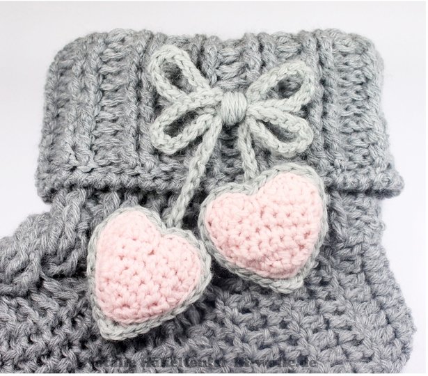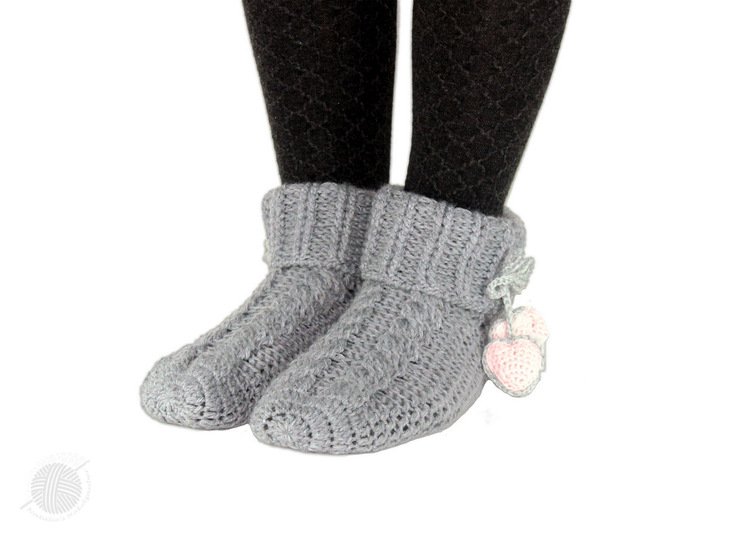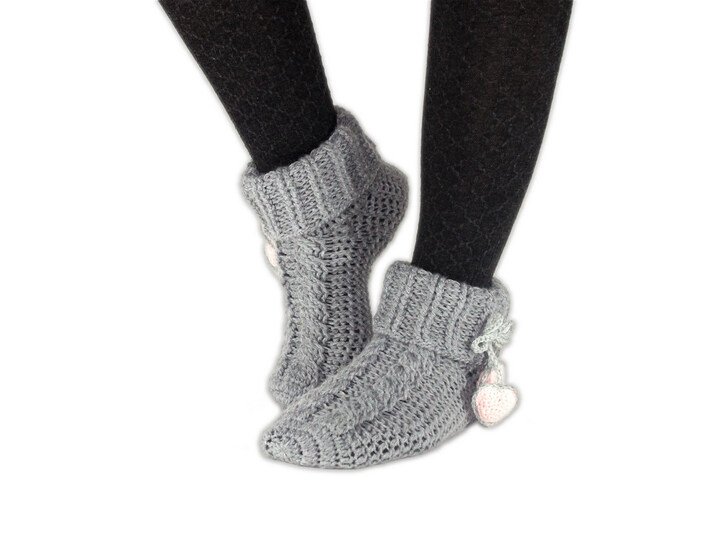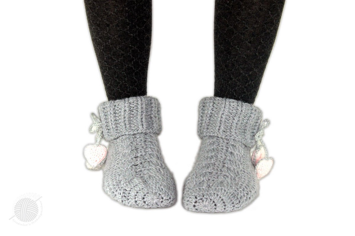 Die umfangreiche, reichlich bebilderte PDF-Häkelanleitung zum Häkeln von Haussocken mit dem Anhänger "Herzen" und dem Zopfmuster, Größen 34-43. Mit diesen Haussocken frieren Ihre Füße nie! Auch schön als kleines Mitbringsel für Freunde und Verwandte.
