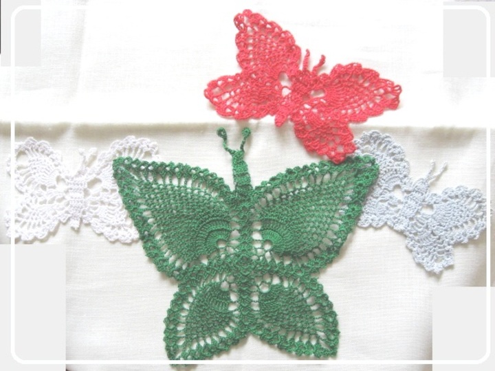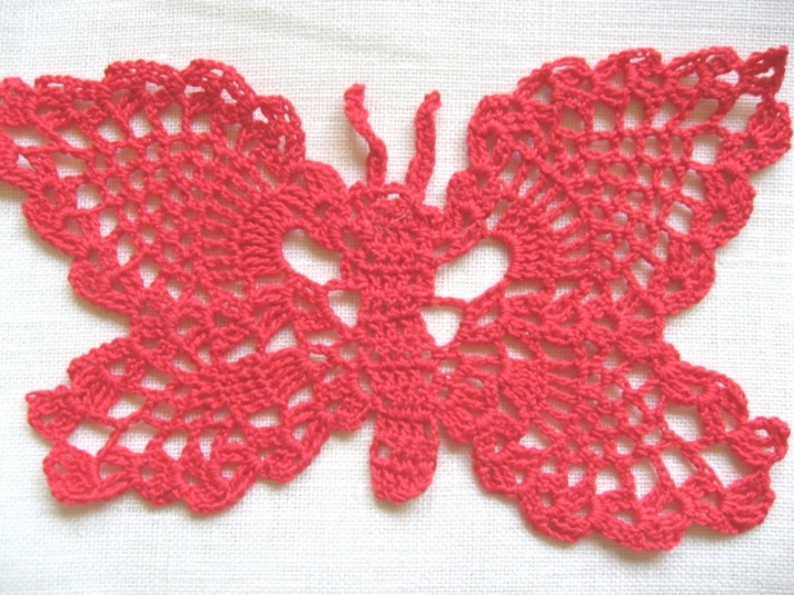 Das fertige grüne Deckchen misst ca. 27 cm –großer Flügel und 21 cm in der Mitte gemessen, das Rote ist 19 x 12 cm groß