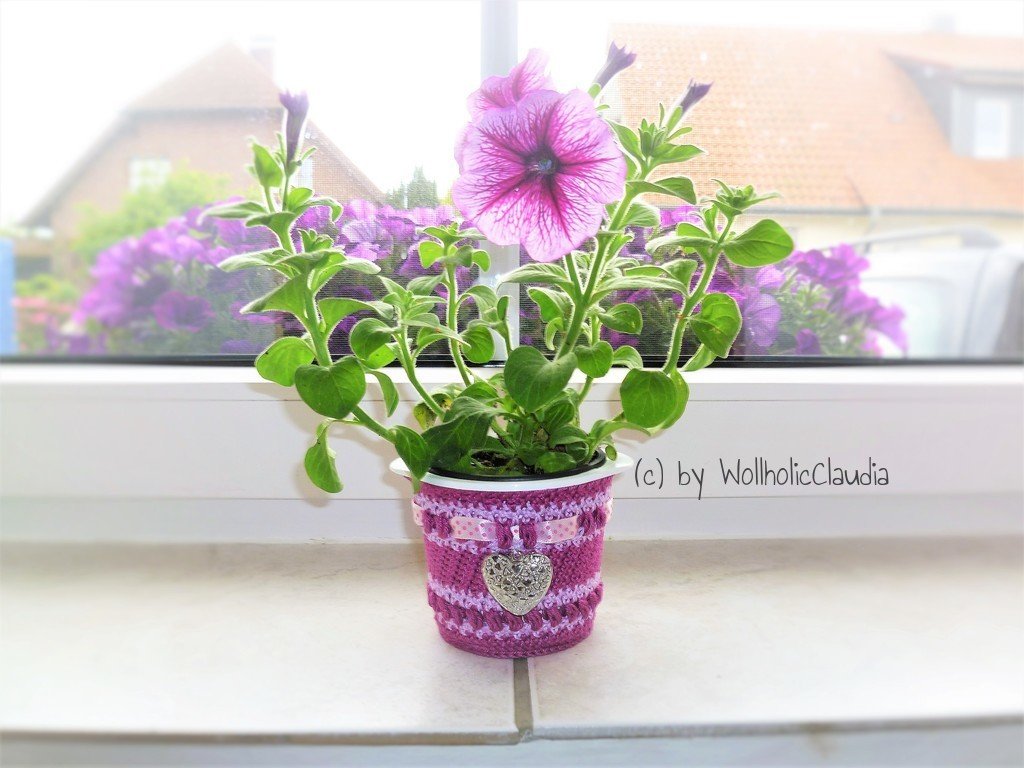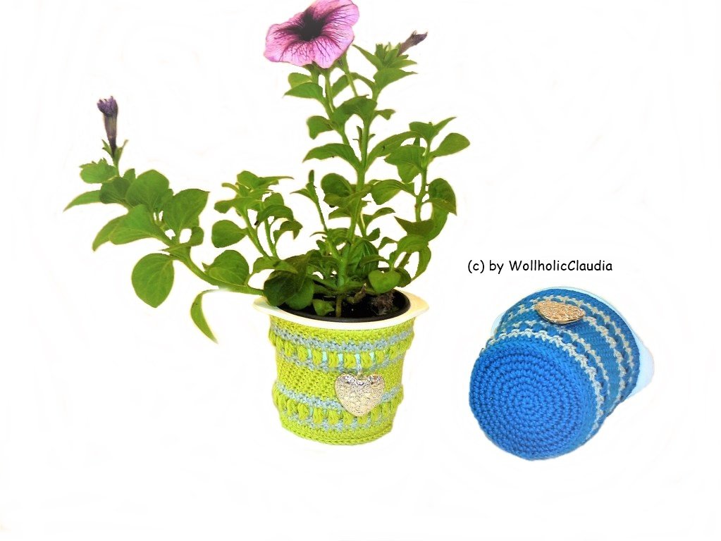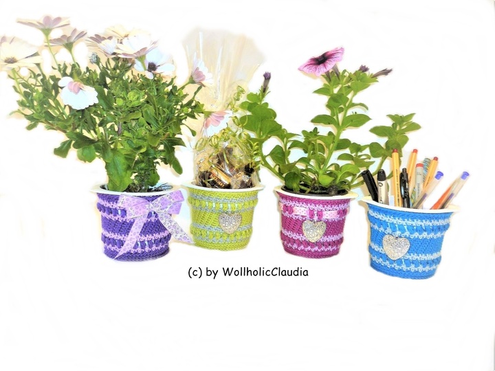 Ob als Blumenübertopf, als Stiftebehälter für den Schreibtisch oder als Geschenkverpackung, dieses wunderschöne "Utensilo" ist immer ein Hingucker. Durch spezielle Anordnung der Maschen ensteht dieses schöne Muster.