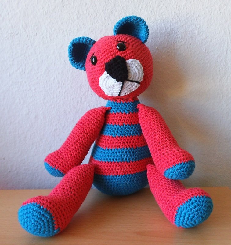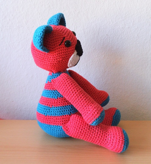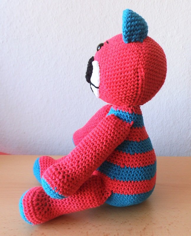 Er ist mit seinen ca. 34cm recht groß für ein Amigurumi, also genug "Kuschelfläche" für kleine oder große bzw. groß gebliebene Kinder ;-)