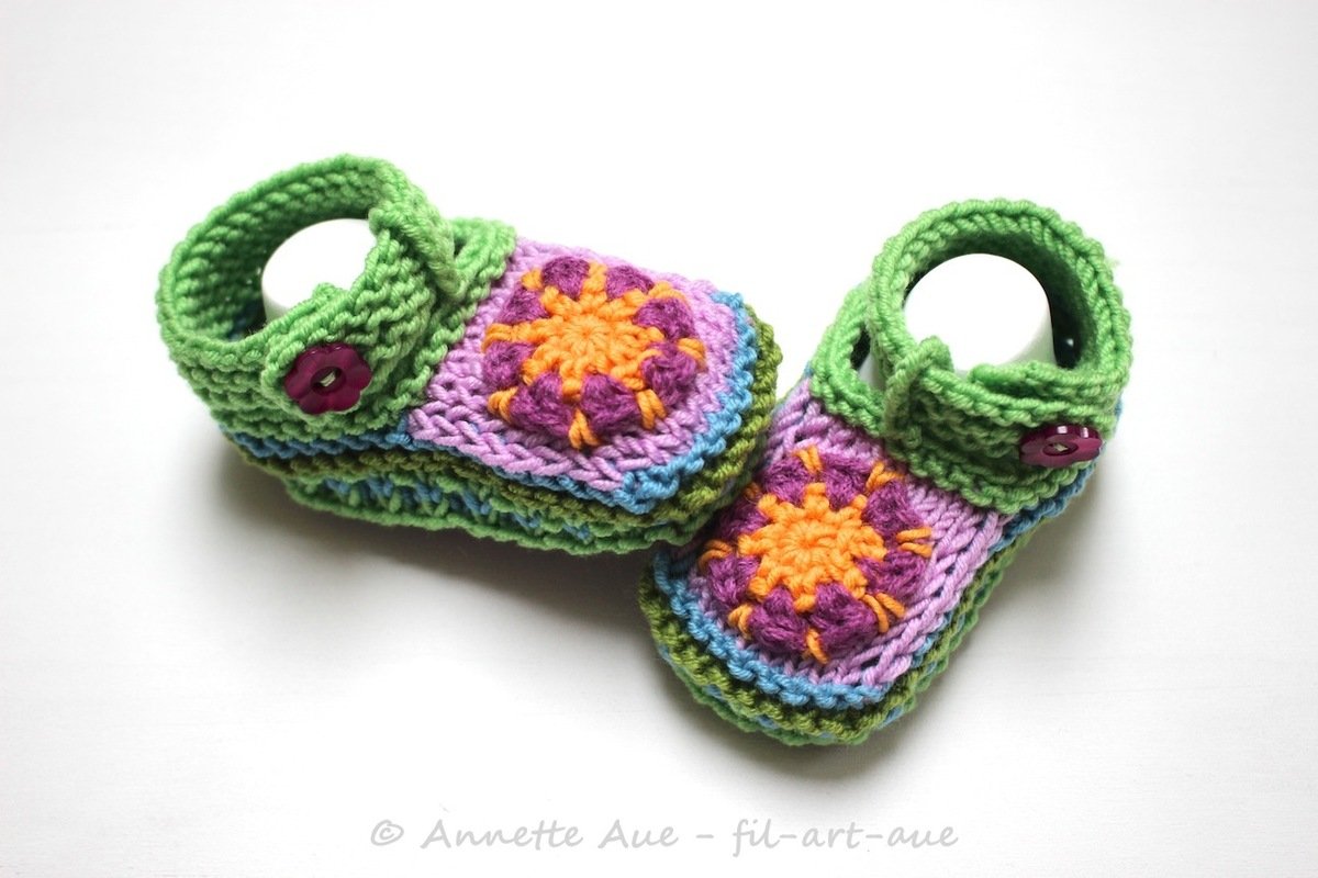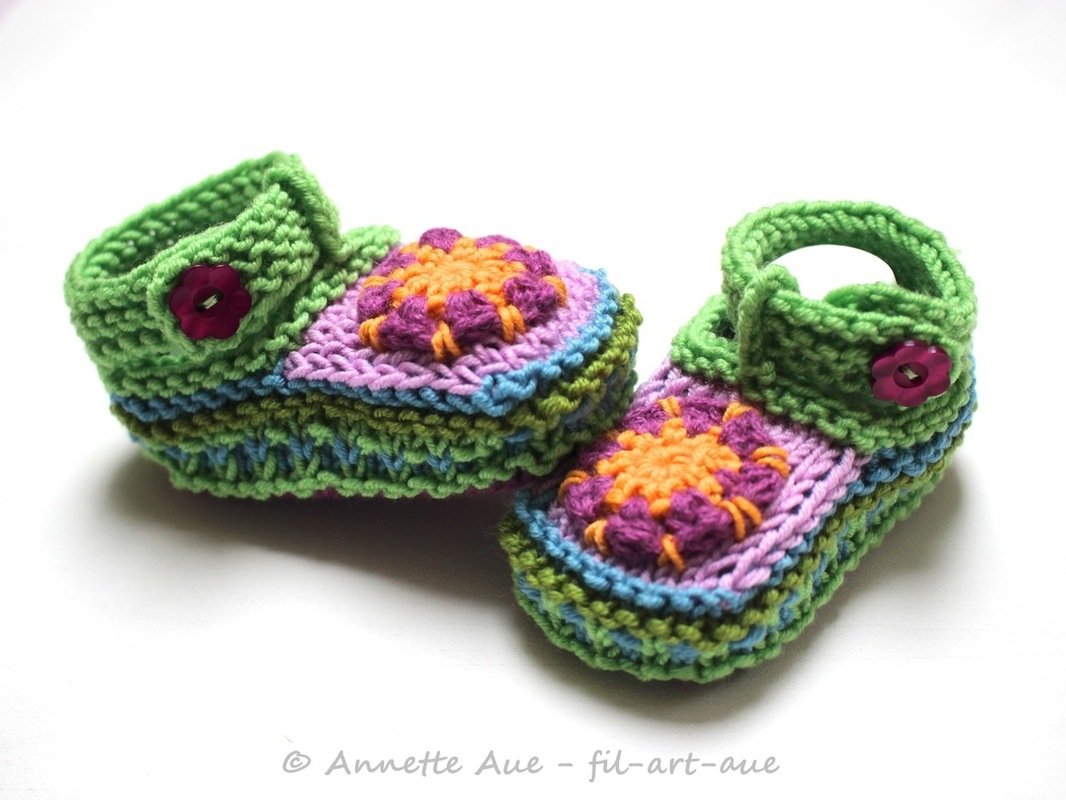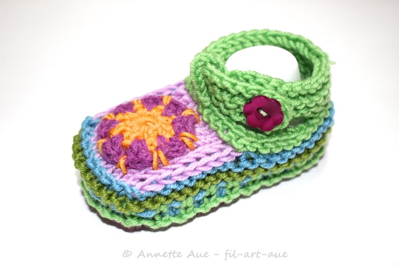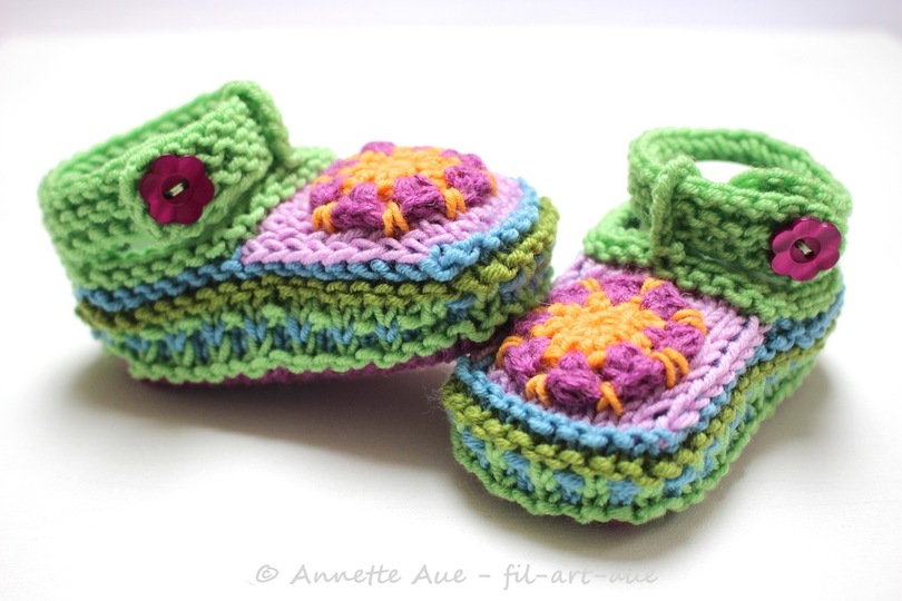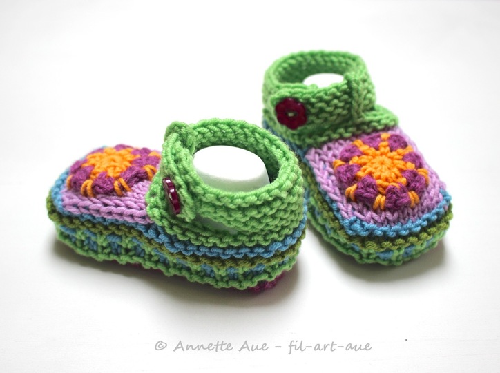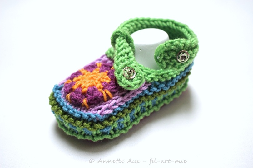 Fröhlich, bunt und zauberhaft sind diese Riemchen-Ballerinas für Eure Kleinsten. Eine sehr ausführliche schriftliche Beschreibung - bebildert mit 31 Fotos für die einzelnen Schritte - führen Dich sicher durch die Anleitung zum Ziel. Das Muster ist einfach zu stricken, es besteht hauptsächlich aus rechten und linken Maschen und einigen abgehobenen Maschen dazwischen. Es ist Reihe für Reihe beschrieben. Im Original habe ich Garnreste aus Schurwolle verwendet, wunderbar für kühlere Tage, die Schühchen werden aber mit Baumwollgarn absolut sommertauglich!