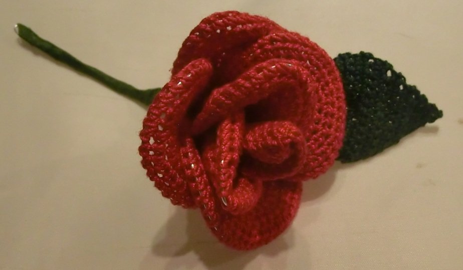 Verwendet wurde Filetgarn Stärke 10 (z.b Manuela), für eine Rose benötigt man ca. 10 g rot und für das Blatt ca. 3 g grün. Die fertige Rose hat einen Durchmesser von ca. 6 cm, die Länge des Stieles ist variabel.
