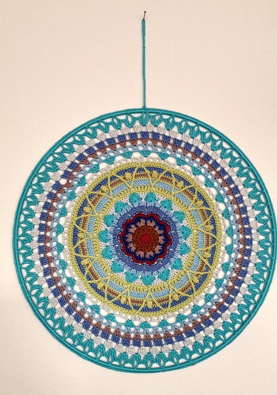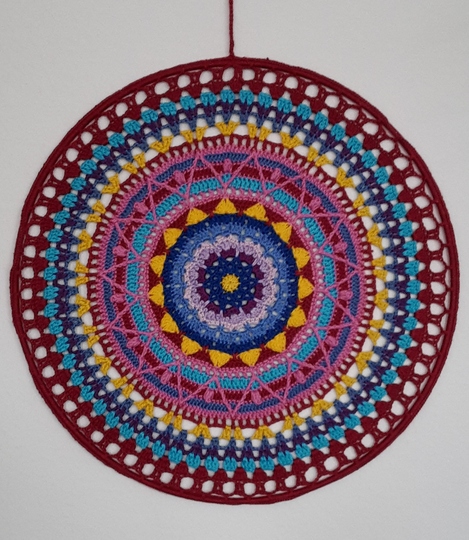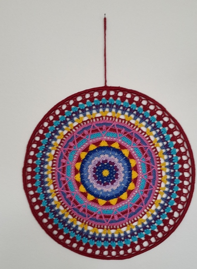 Ich biete Euch an, ein gehäkeltes Mandala mit dem Durchmesser 40 cm. Meine anderen Mandalas sind im Schnitt von 10 bis 25 cm im Durchmesser.