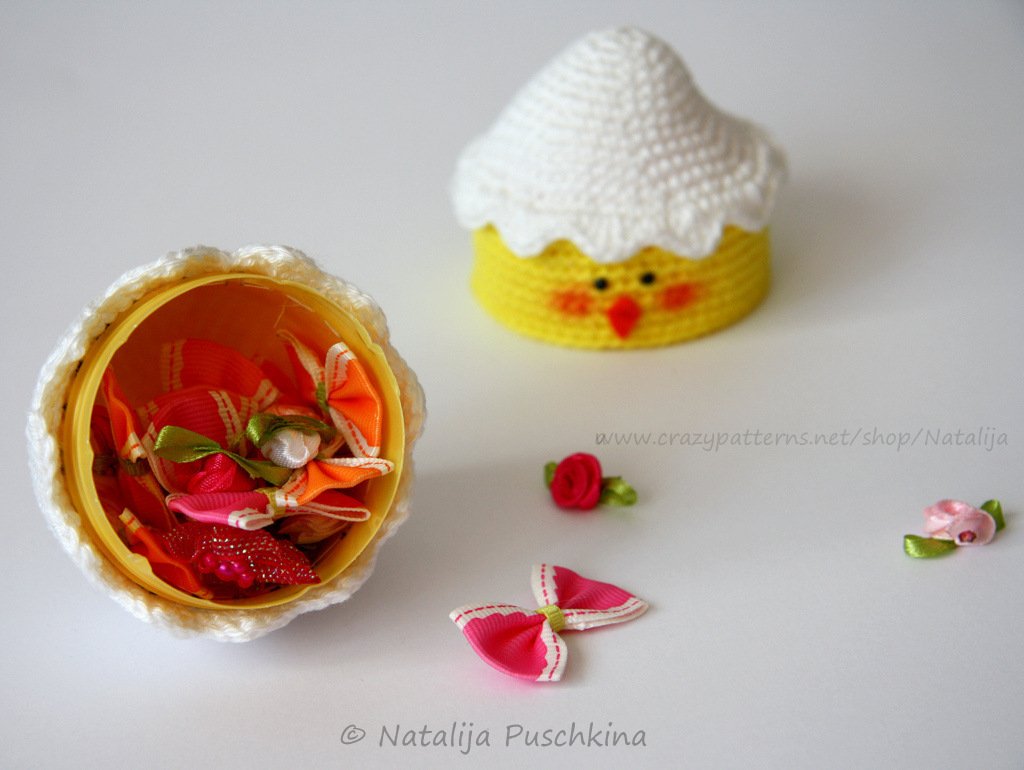 Verkauf der von Dir hergestellten Körbchen ist möglich: Du darfst Schatzkisten 'Küken im Ei', die Du mithilfe meiner Anleitung zum Häkeln gefertigt hast, in beliebiger Stückzahl gewerblich verkaufen. Bitte den Hinweis: „Angefertigt nach dem E-Book von Natalija Puschkina https://www.crazypatterns.net/de/store/Natalija“ dazusetzen.