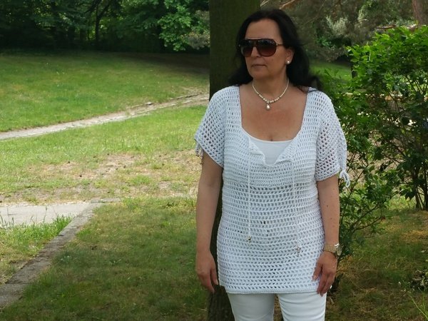 Ein einfaches Muster wird ergänzt durch den besonderen Halsausschnitt ,der mit 2 Kordeln geschlossen werden kann.