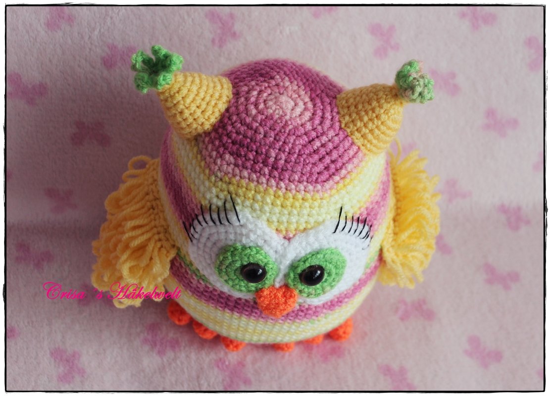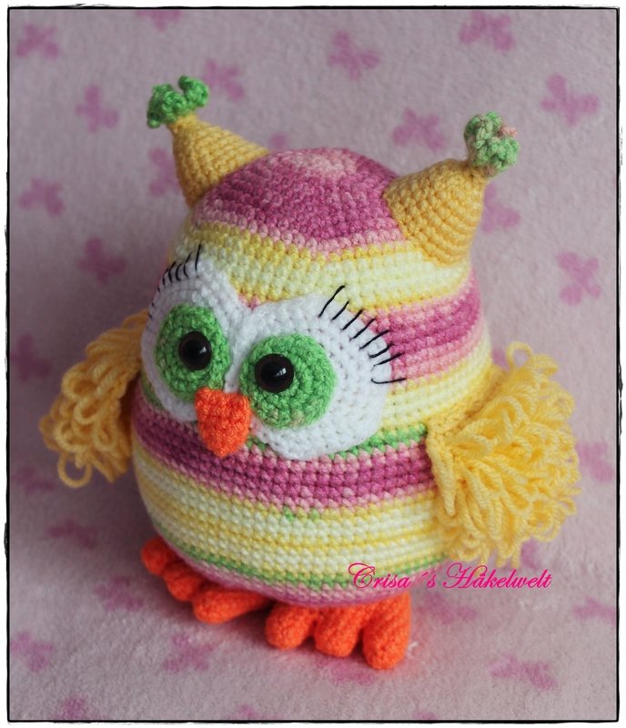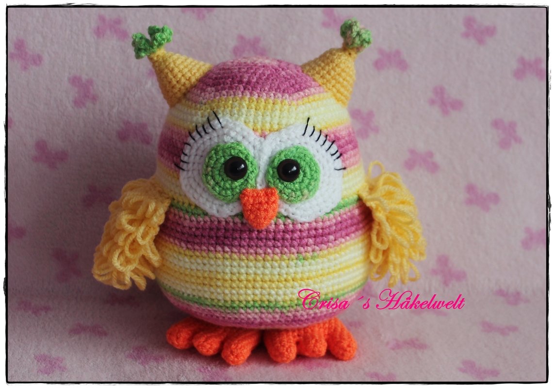 Hallo! Lass uns zusammen diese Eule häkeln! Mit den angegebenen Material wird sie etwa 28 cm groß.