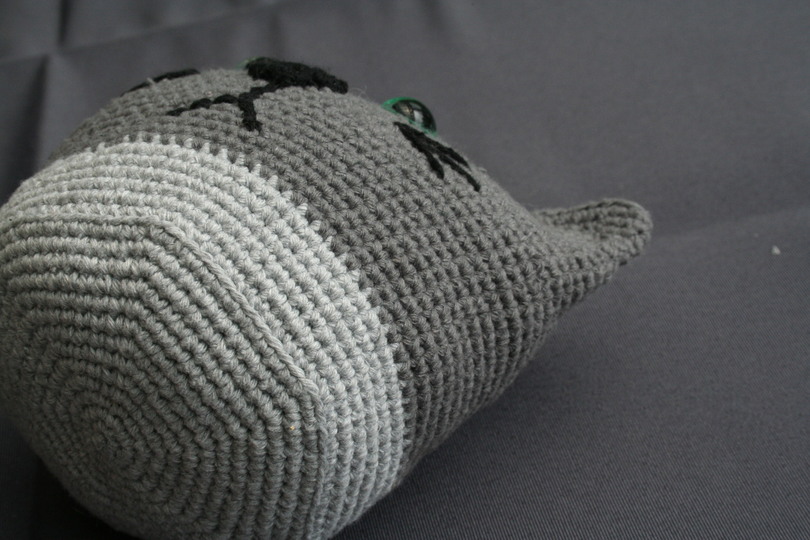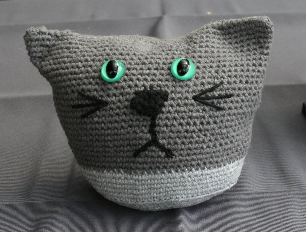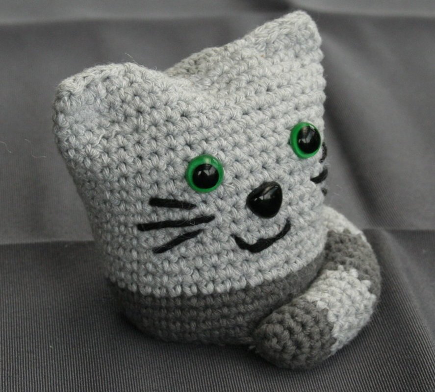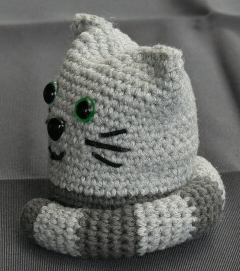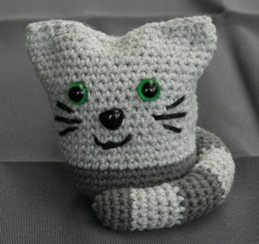Den Katzen kann man gut an einem Abend häkeln. Mit der entsprechend schweren Füllung eignen sich die große Katze hervorragend als Türstopper und die kleine als Briefbeschwerer. Wer Sie für Kleinstkinder macht, sollte statt der Sicherheitsaugen lieber ein paar Augen aufsticken.