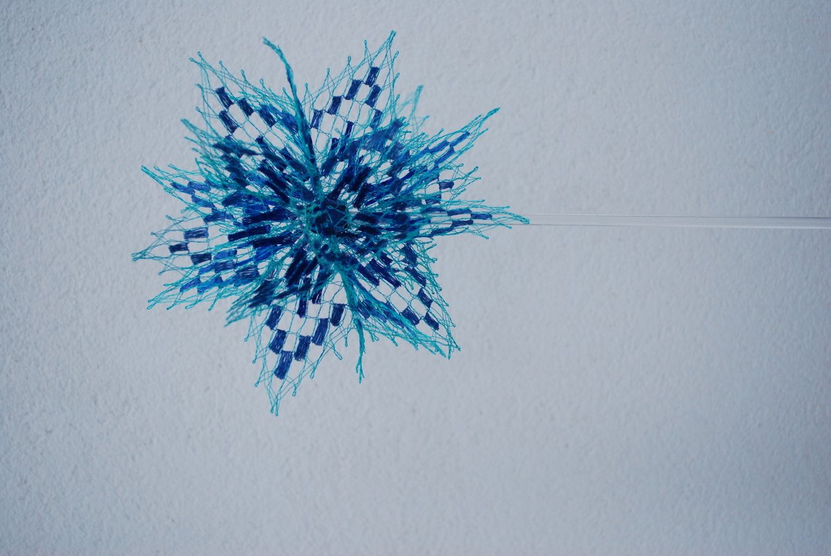 Alle Arbeiten sind mit durchlaufenden Fäden geklöppelt. Bast, Hanf und Perlen ergänzen die Formen.