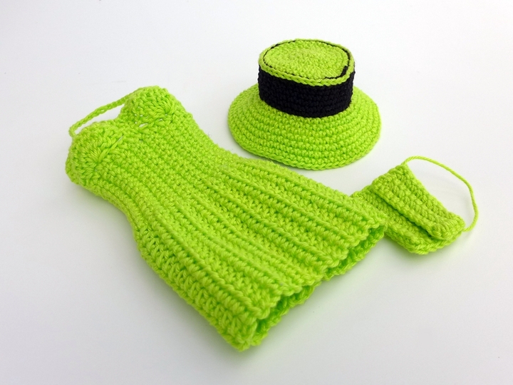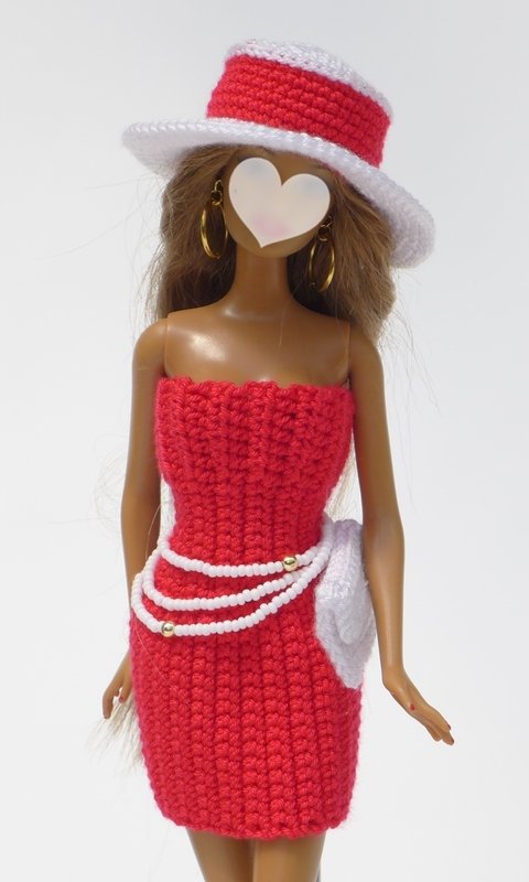mit nur 30 g "Catania Fine" von Schachenmayr und einer Häkelnadel der Stärke 2,5 häkelt Ihr an einem Abend dieses schöne figurbetonte Kleid, einen passenden eleganten Hut und eine Clutch. Das Kleid hat einen Neckholderverschluss und wird auf dem Rücken mit einem feinen Gummiband (Hutgummi) geschnürt. Die Büste und die Taille sind schön ausgearbeitet, so dass die Figur der Puppe gut zur Geltung kommt. Die Sachen passen kleinen Anziehpuppen, die ca. 28 bis 30 cm groß sind.
