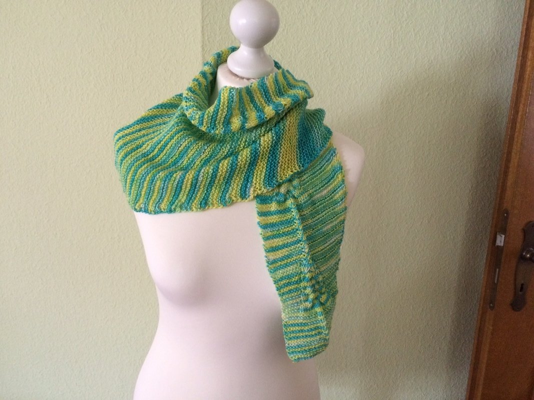Ich habe für das Tuch ein Englisches Garn mit Seide genommen, das eine Lauflänge von 365 Metern / 100g hat, und Nadelstärke 3,5.