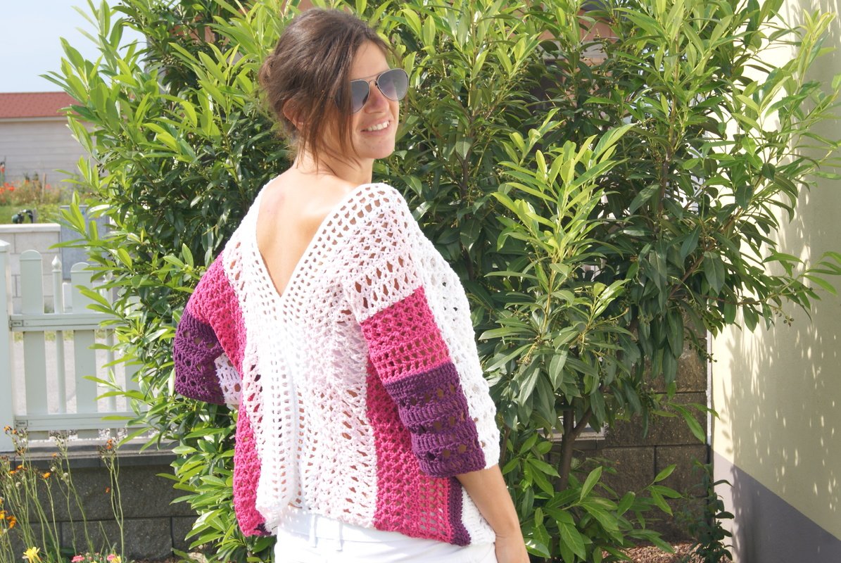 Du kannst dir dieses Unisize-Shirt ganz leicht anpassen. Der Lm-Anschlag ist die Länge und die Anzahl der Reihen ergibt die Breite. Du musst dabei nur berücksichtigen, dass der Luftmaschenanschlag durch 3 teilbar plus 2 und durch 2 teilbar plus 1 ist, damit das Muster aufgeht.