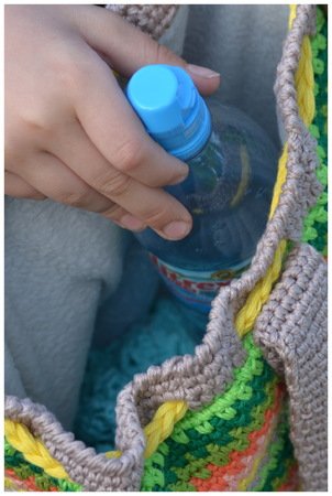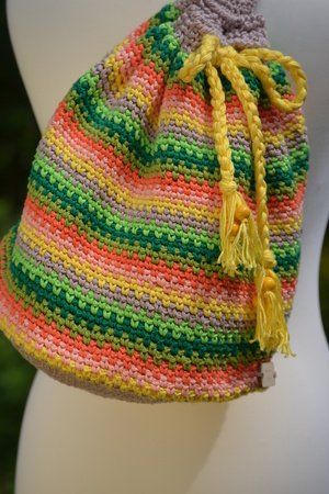 Diese fröhlich bunte Tasche habe ich aus einer Haupt- und 6 weiteren sommerlichen Farben gehäkelt. Ich habe diese in gelb-orange und in Grüntönen aufeinander abgestimmt. Da du von den farbigen Knäulen für die Ringel nicht so viel Material benötigst, kannst du gut Restgarne verwenden und auch ganz viele Farben bunt mixen. Dann wird diese tolle und bunte Tasche ein ganz besonderer Hingucker.