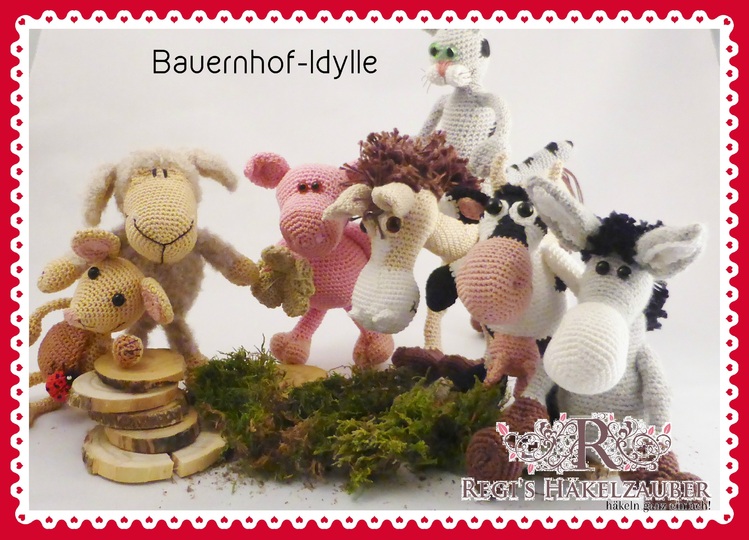 Mit diesen einfachen, detailliert ausgearbeiteten Häkelanleitungen kannst Du Deine eigenen Bauernhoftiere zaubern. Die Anleitungen gibts für die Maus, die Kuh, Pferd, Schaf, Schwein, Katze und Esel