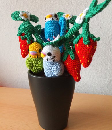 Dieser Wellensittich Erdbeerstrauch ist eine sehr eigenwillige "Kreation", die einfach so entstanden ist. Ich hatte die Wellensittiche und den Erdbeerstrauch und habe einfach beides zusammengesetzt und war ganz begeistert von dieser Kombination - alleine schon der Farben wegen ;-)