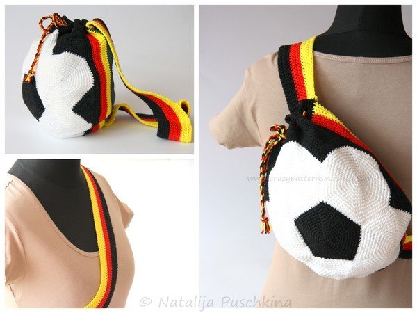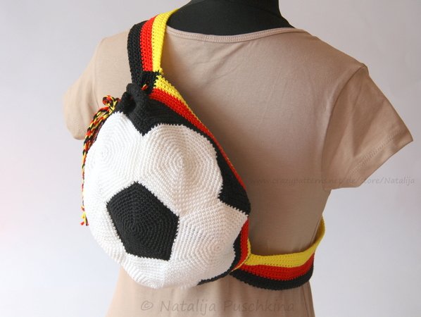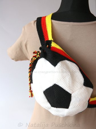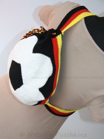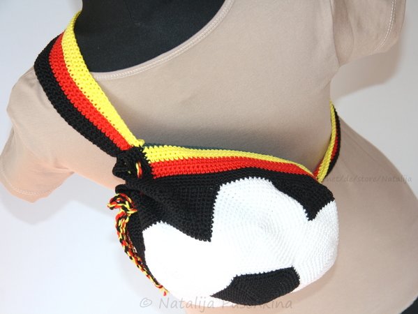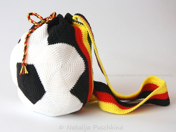 Er ist schnell gehäkelt und macht jedem Fußball Fan Freude. Natürlich kannst du den Beutel auch in deinen Lieblingsfarben (Verein / Land usw.) arbeiten. Es passt viel hinein, ob zum Training oder zum Public Viewing.