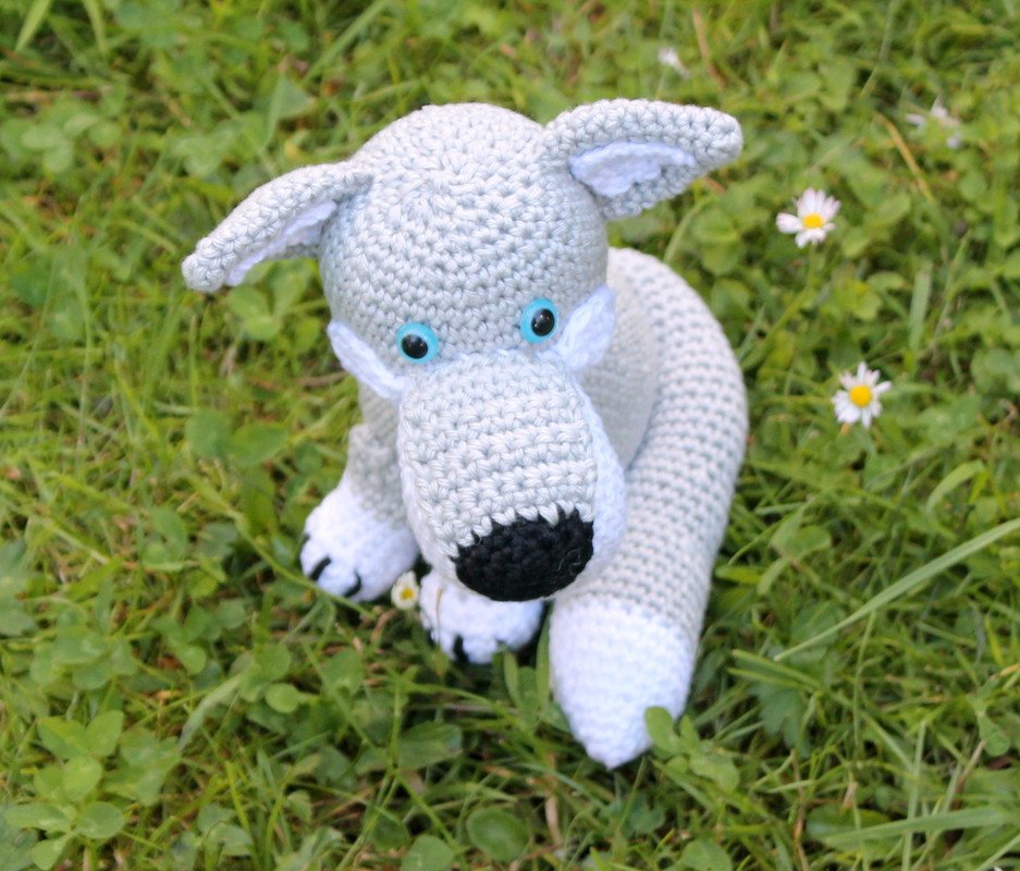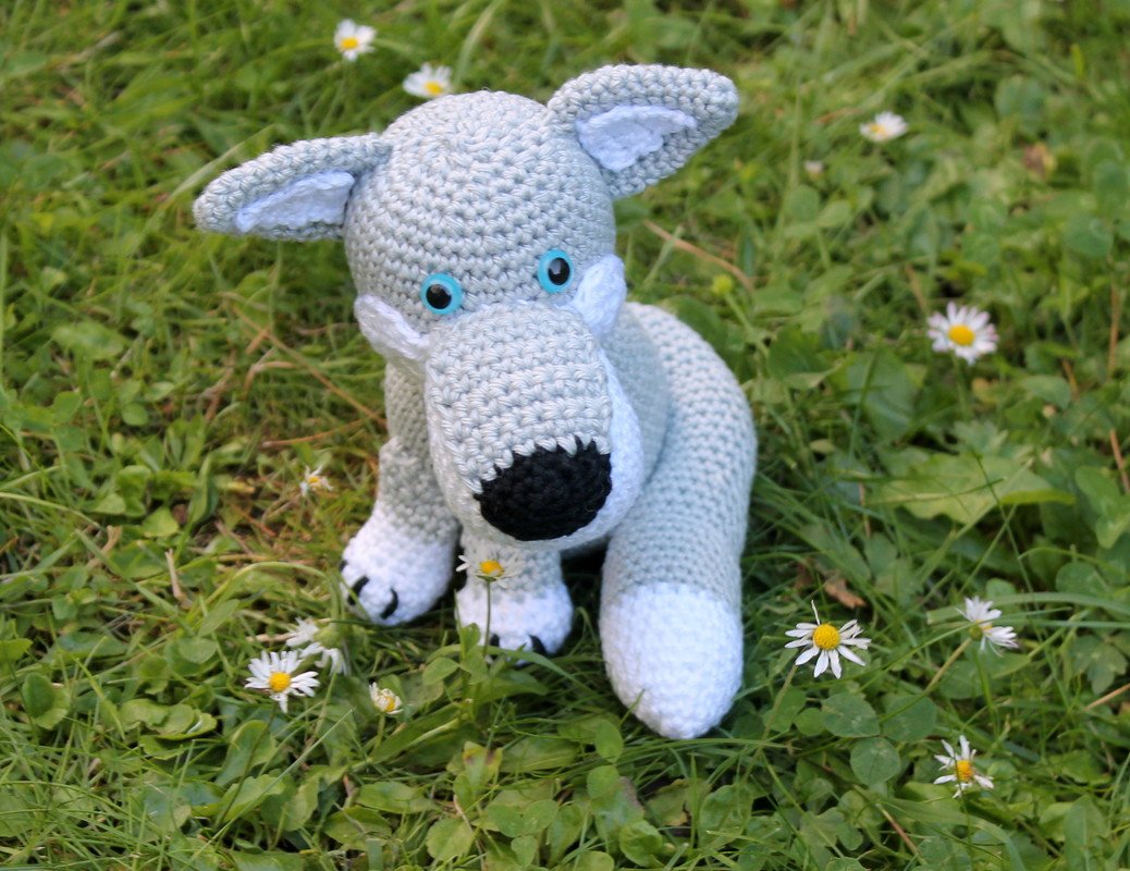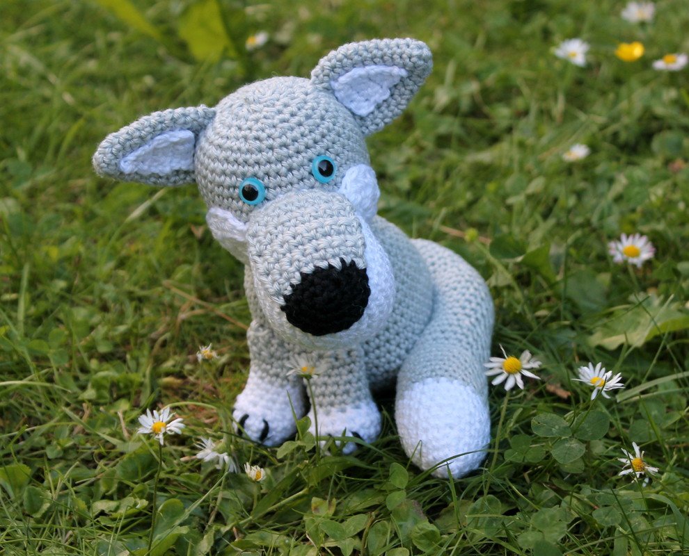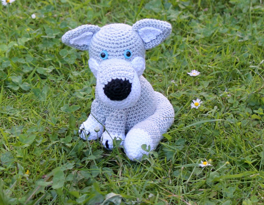 Fertig gehäkelt ist der Wolf ca 12 cm groß.