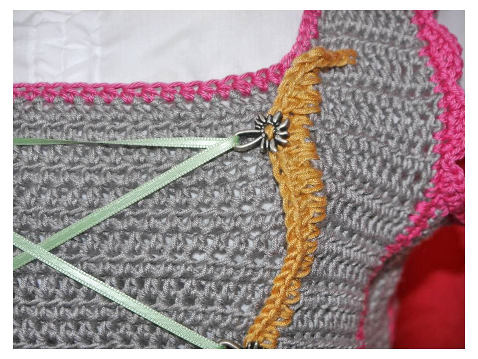 Ich habe mit Häkelnadel 4 und Bamboo Blue Garn gearbeitet (Bamboo Blue hat eine ähnliche Stärke wie die catania Uni), man benötigt natürlich auch eine Sticknadel, Satinband und 6 - 8 Dirndl-Ösen