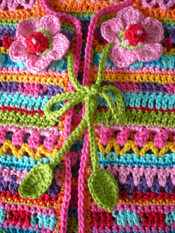 Die Anleitung ist ausführlich Reihe für Reihe beschrieben. Die Farb- und Musterfolge ist in einer Häkelschrift für beide Größen dabei. Die Blümchen, Bänder und Blätter sind ebenfalls ausführlich beschrieben und bebildert.