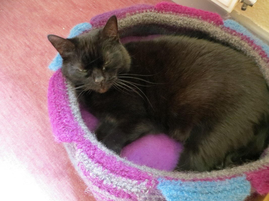 Anleitung für einen ca. 40 cm großen Katzen-Kuschel-Korb. Technik: häkeln und filzen.Die Anleitung enthält ausführlichen Text und detaillierte Fotos und ist für Anfänger mit etwas Ausdauer gut geeignet. Hervorragend für Filzwollresteverwertung!