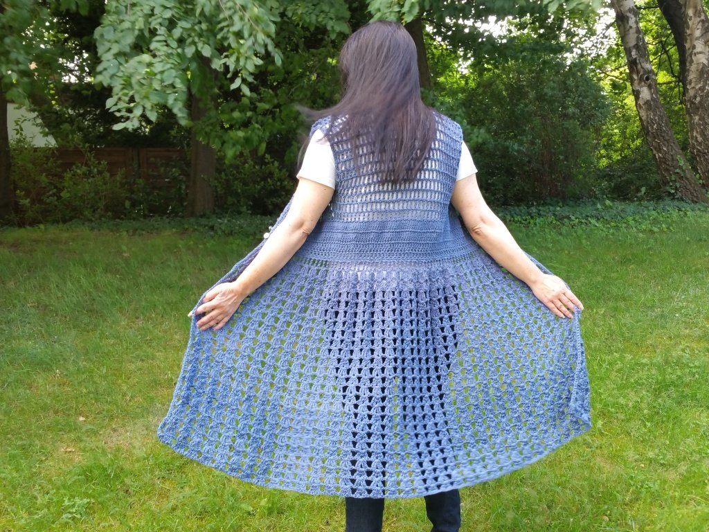Wer sie nicht auf Taille tragen möchte lässt die Knöpfe weg und arbeitet die Taille etwas breiter ,wie wird in der Anleitung erklärt ,schließen kann man die Weste auch mit einem Band,alles in allem ein sehr vielseitiges Modell,das zum Nachmachen einlädt.