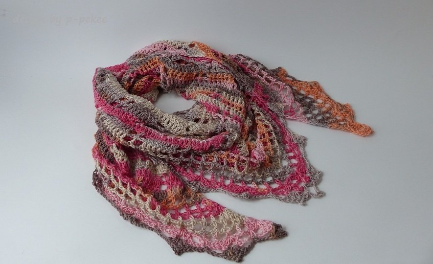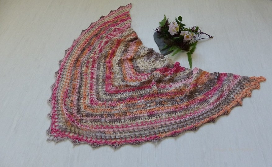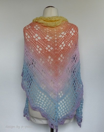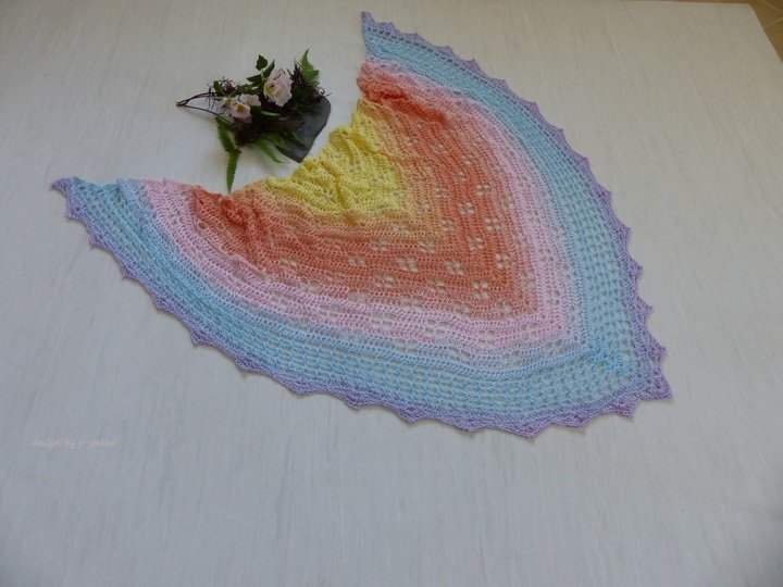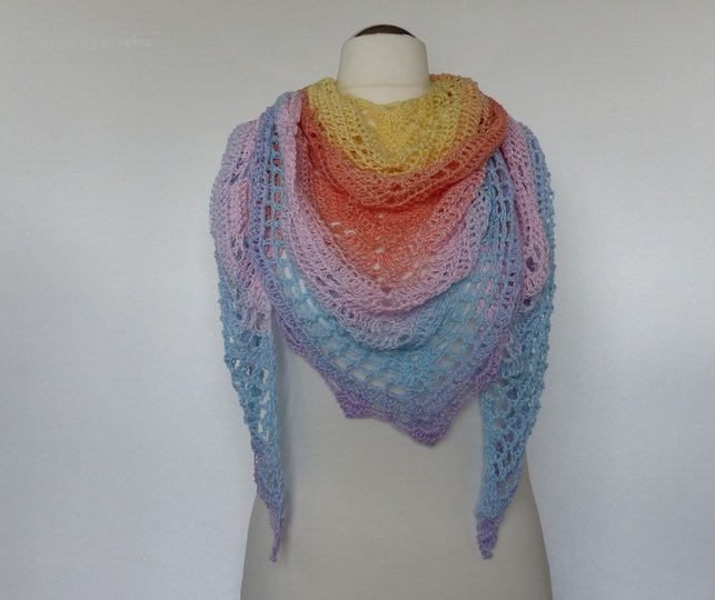Das pastellfarbene Häkeltuch ist ca. 170 cm Breite und 90 cm Höhe und wurde mit einem Bobbel 800m (4-fach) gehäkelt.