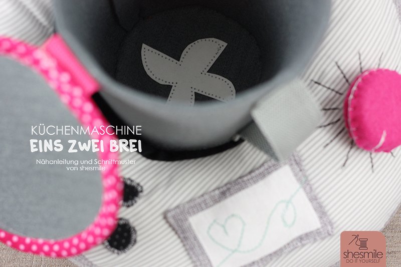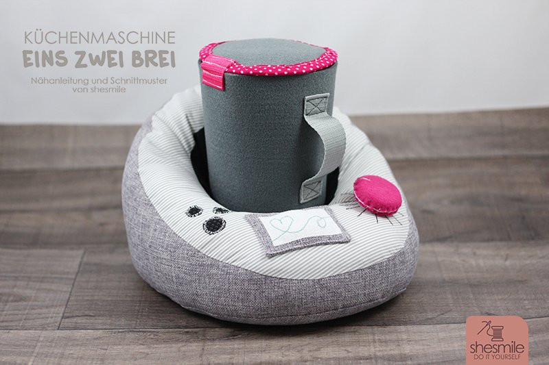 Nähanleitung und Schnittmuster gestaltet als PDF-E-Book für eine Küchenmaschine "Eins Zwei Brei" aus Stoff mit Kochtopf und Bedienfeld.