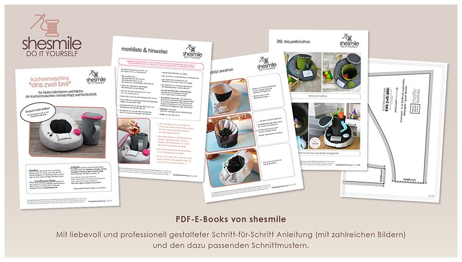 PDF-E-Books von shesmile: Diese leicht verständliche Schritt-für-Schritt-Anleitung mit vielen Fotos ist auch für Nähanfänger geeignet, denn die sehr ausführliche Fotoanleitungen begleitet dich bei jedem Schritt.