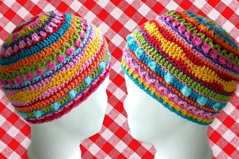 Eine tolle farbenfrohe Häkelmütze. Sie wird aus Baumwolle gehäkelt und ist ideal für kühle Sommertage.