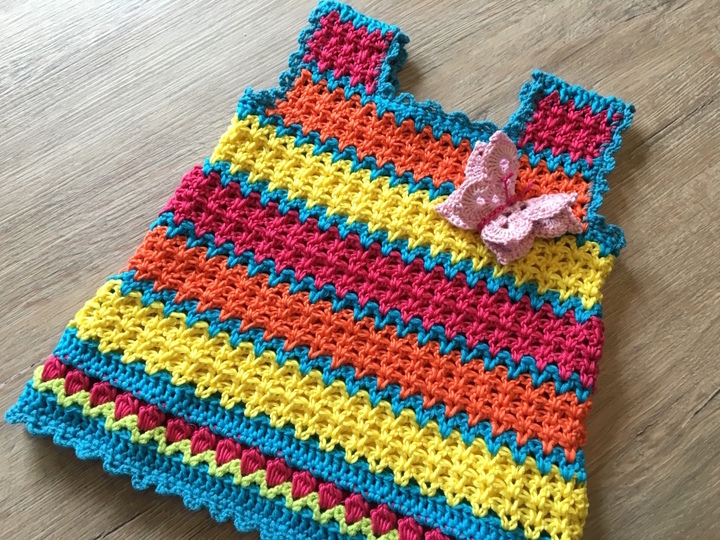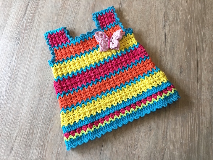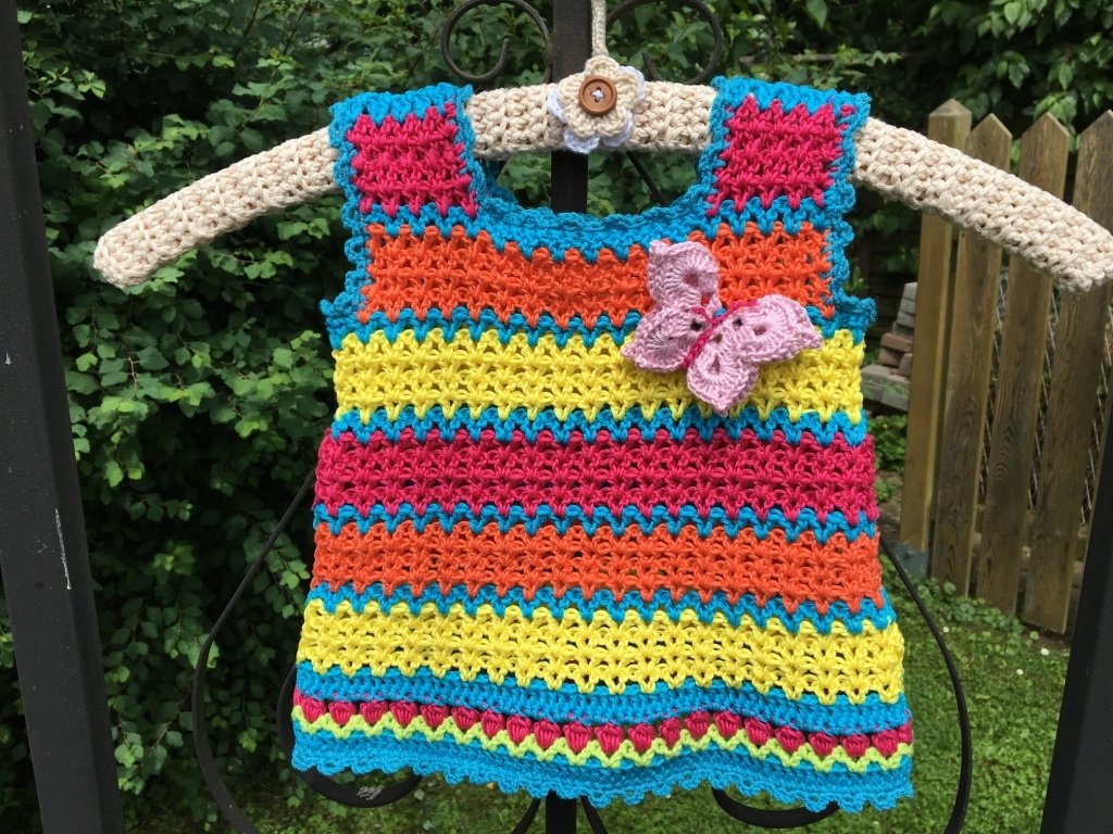 Ein fröhliches Trägerkleid / Tunika in A-Form für kleine Damen. Den Kleidersaum schmückt eine Tulpenborte und ein 3-D-Schmetterling sitzt am Halsausschnitt.