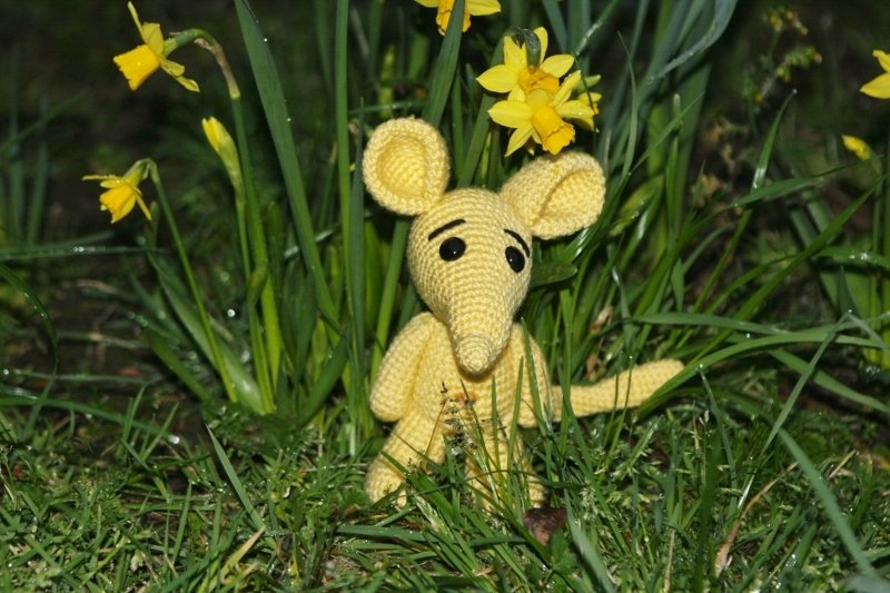 Bei Verwendung von Schachenmayr Bravo und Nadelstärke 2,5 wird Rattus im Stehen etwa 15 cm groß.