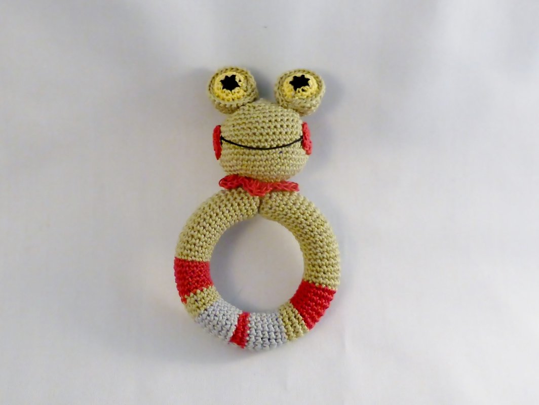 Die Baby Rassel / Greifling Frosch Quax enthält auch ein Glöckchen, damit das Baby Klänge erzeugen kann beim Schütteln.