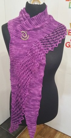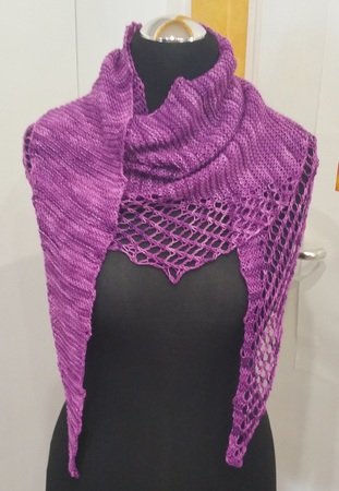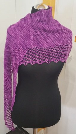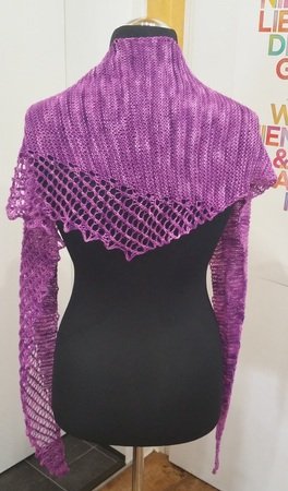 Rondina wird seitwärts gerabeitet und ist aufgrund der Zunahmen ein schmales Dreieckstuch. Es ist asymmetrisch, d.h. die Form ist symmetrisch, das enthaltene Lacemuster aber nicht!